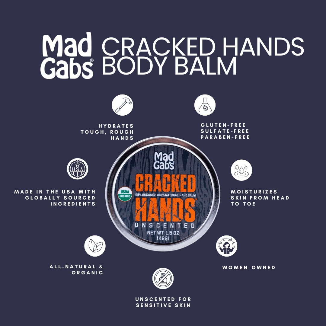 100% natural and organic, our Cracked Hands is a powerful tool to treat tough, rough hands with simple, effective ingredients to soothe cracks, calluses, cuticles and dry knuckles.