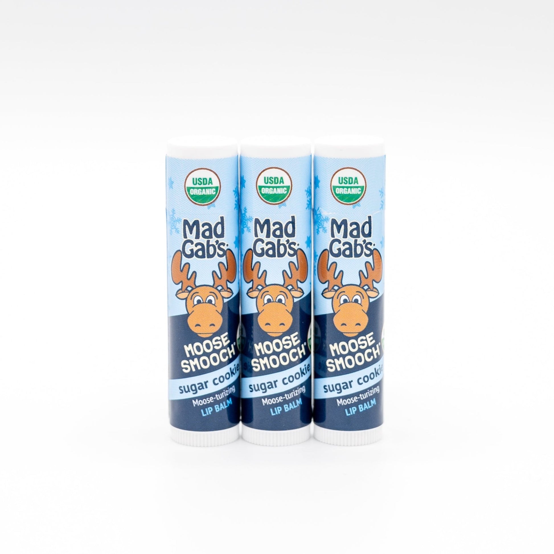 Celebrate the holidays with a little Moose Smooch under the moose-L-toe! Mad Gab’s Organic Moose Smooch Lip Balm makes people happy from the outside-in. Cute moose packaging is just the start, and then we throw in great organic flavors that appeal to all ages. Our easy-to-pronounce list of ingredients is short, simple and effective at softening and smoothing dry and chapped lips.